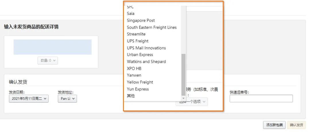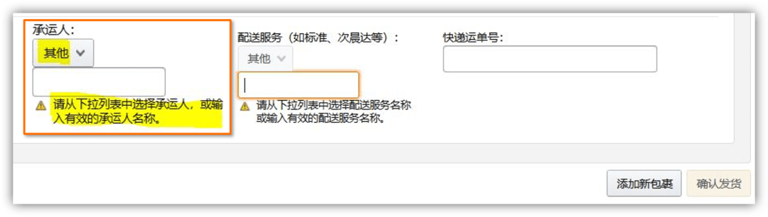 *如果承运人不在下拉菜单中,选择【其他】,并输入承运人的名称,但选择【其他】的订单将不被计入有效追踪率