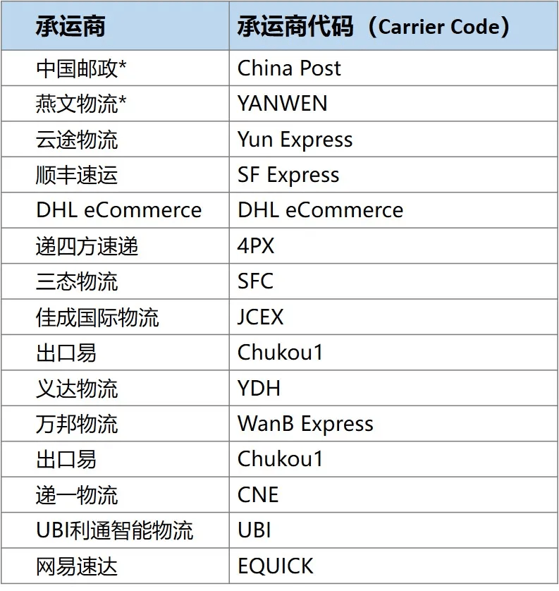 需为每个订单提供 carrier-code(使用 API 时提供 CarrierCode)