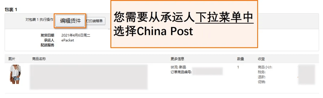您需要为您已经确认发货的包裹提供有效追踪信息。如果您的订单信息进行了更换,比如承运商和快递运单号需要更新,卖家需要在订单页面重新搜索该订单编号,进行修改(点击Edit),在订单预计送达日期完成日内都是可以进行修改的。