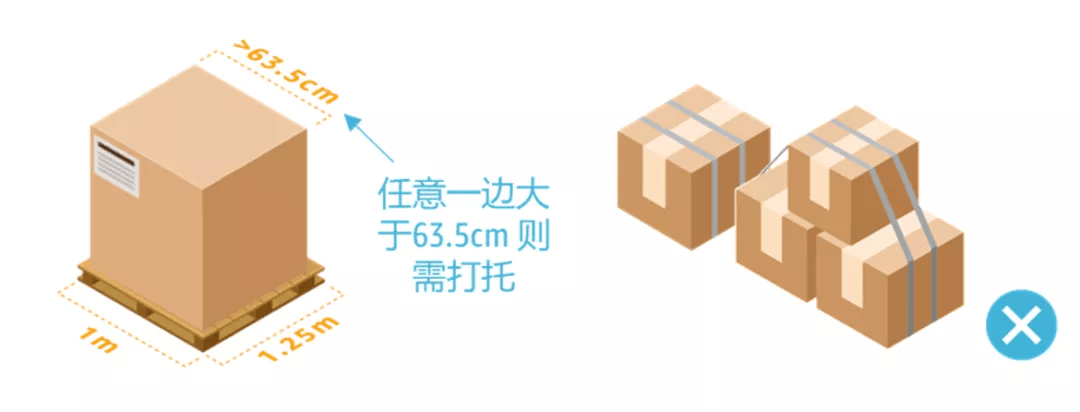 纸箱任意一边尺寸不得超过63.5cm(日本站尺寸不得超过50cmx60cmx50cm),超过则要放置在1m×1.25m的托盘上(英国站放置在1.2m×1m,欧洲其他站放置在1.2m×0.8m的托盘上)。