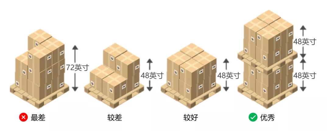 以下是亚马逊建议您采用的双层托盘纸箱堆叠方式(1in=2.54cm),亚马逊运营中心接受双层托盘,前提是托盘必须能够安全装卸,且不会在运输过程中造成商品残损。您可以根据需要双层堆叠托盘,以便尽可能提高货运效率。请遵循有关双层托盘的下述指南: