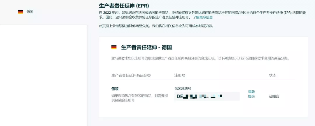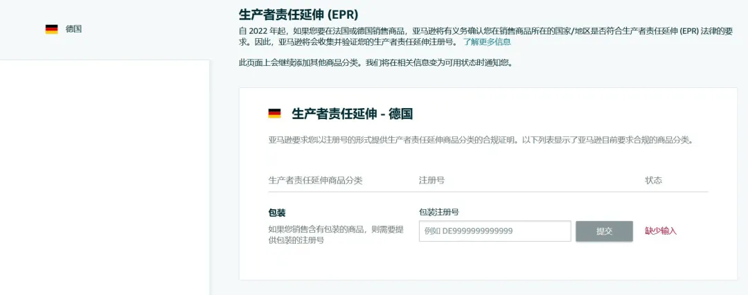 生产者责任延伸(EPR)是一项环境政策,要求生产者对其在市场上所推出商品的整个生命周期负责,即从商品设计开始到商品生命周期结束(包括废弃物收集和处理)。自 2022 年起,如果您要在法国/德国销售商品,亚马逊将有义务确认您在销售商品所在的国家/地区是否符合生产者责任延伸(EPR)的要求。因此,亚马逊将会收集并验证您的 EPR 注册号。