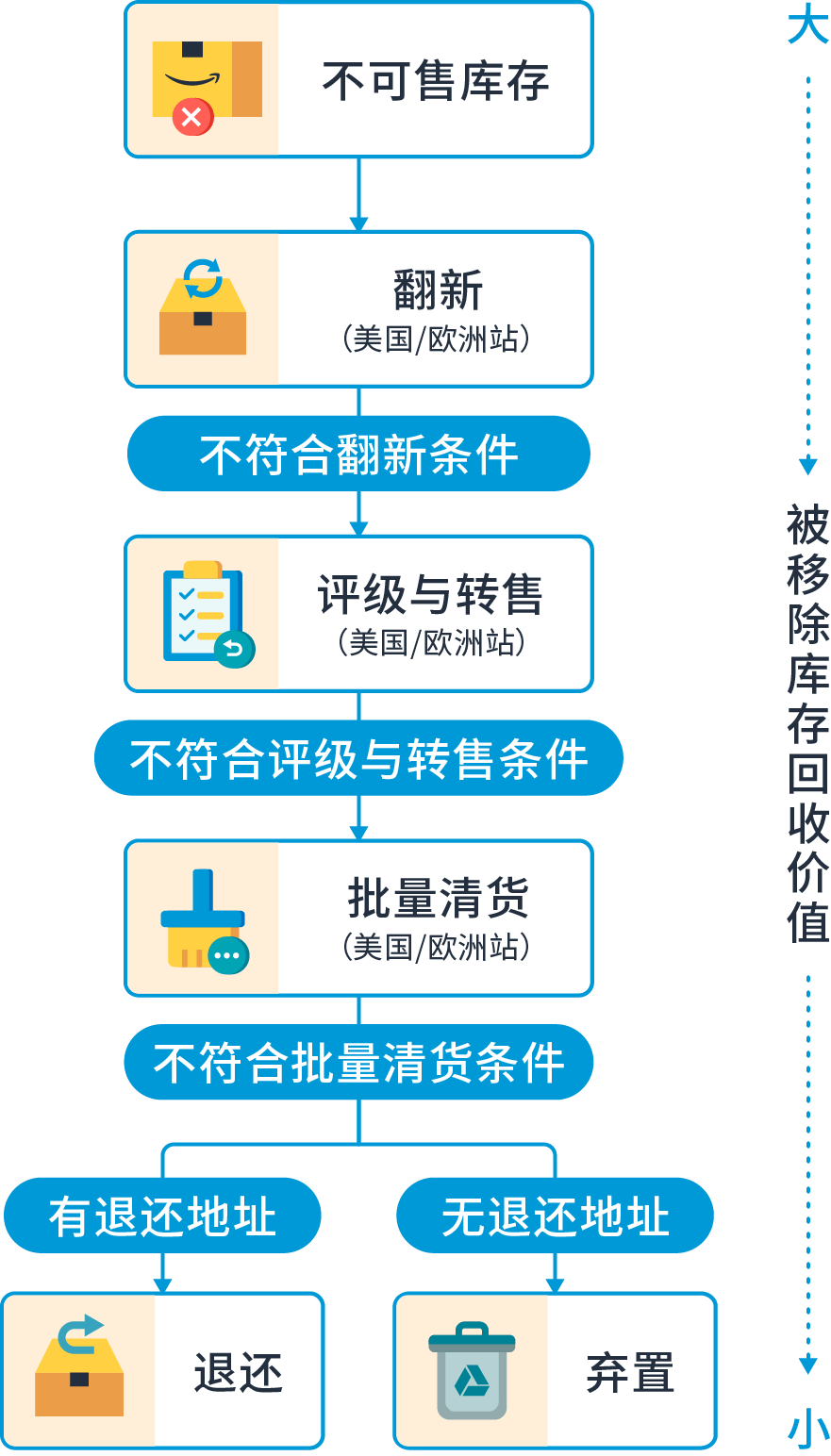 卖家可以通过亚马逊物流评级与转售计划在亚马逊商城重新发布符合要求的不可售库存。由于是您负责管理二手商品并控制商品价格,因此您可以控制回收价值。