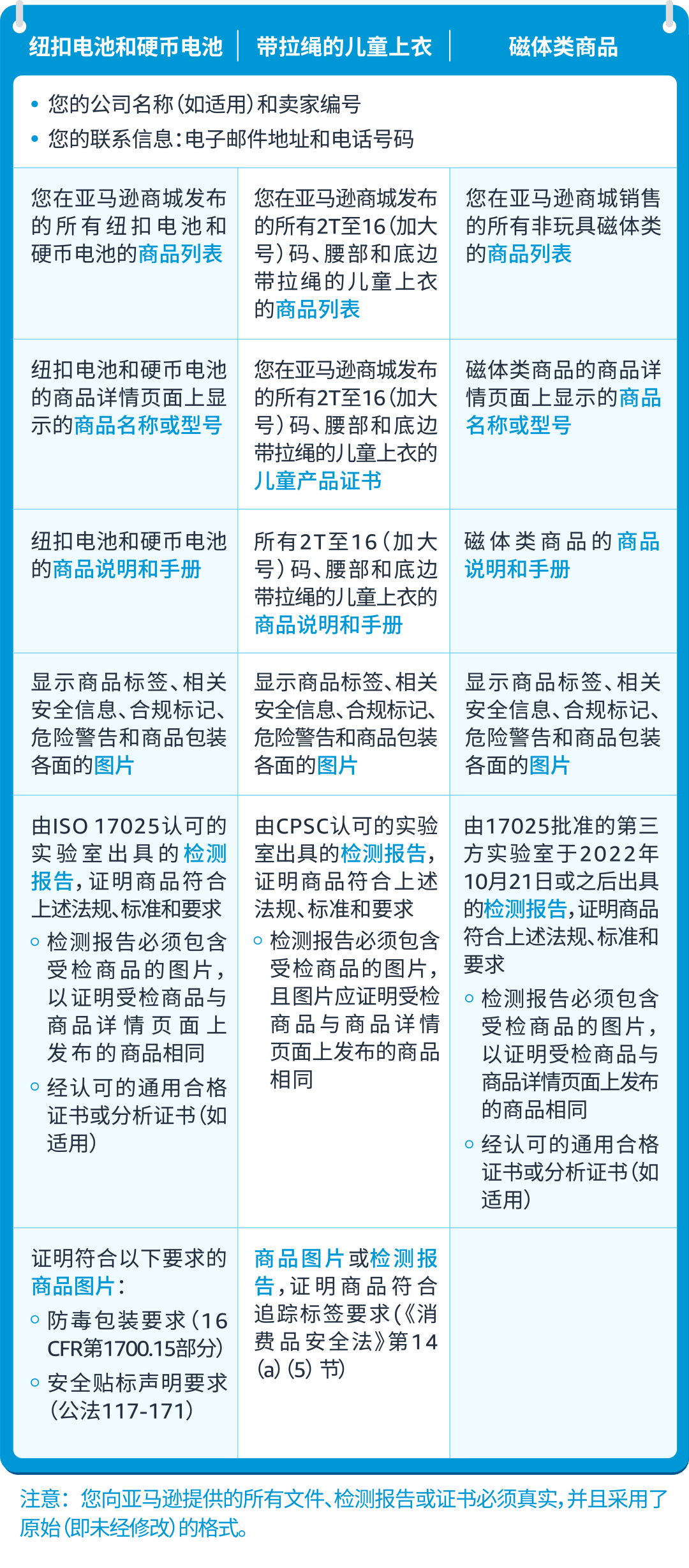 近期,不少美国站卖家陆续收到了亚马逊题为“【需要采取行动】请提交您的合规性文件”的邮件。此次需要上传的合规性文件针对“纽扣电池和硬币电池”、“带拉绳的儿童上衣”和“磁体类商品”品类,请销售这三个品类的卖家及时关注并完成合规要求!