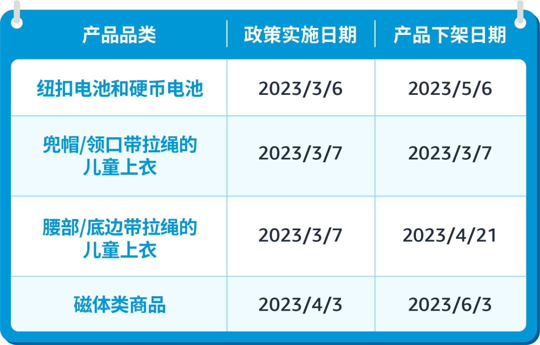 在此,小编为大家整理了不同品类合规政策实施的关键时间点,详情可参考下方表格。如果您未在产品下架日期前提交合规文件并成功通过审核,您的产品将面临下架风险,建议您尽快采取行动,完成合规要求!