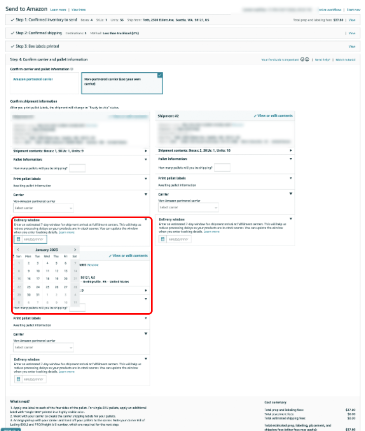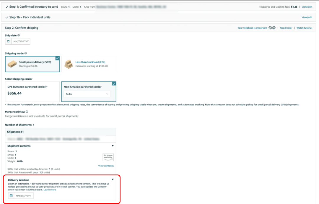 当您使用“发送至亚马逊”(Send to Amazon)创建货件时,如果您选择通过非亚马逊合作承运人运送小包裹货件,那么请在第2步:确认发货中,页面下方出现的“送达时段”(Delivery Window)必填项中指定送达时段。