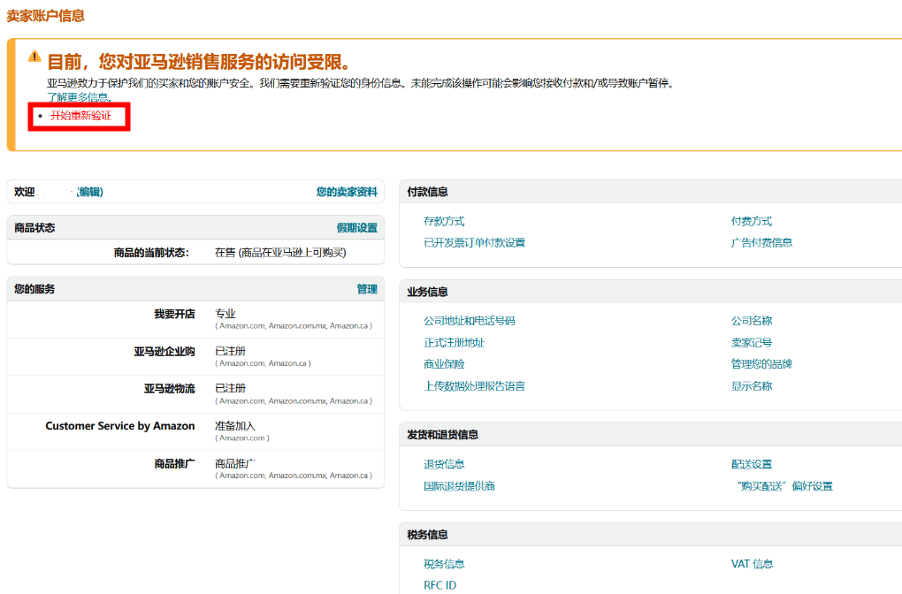 ②若验证失败,卖家可以在同一位置点击“开始重新验证”来重新启动验证过程。如果在法规生效后还未能成功完成验证,卖家对亚马逊销售服务的访问将受到限制。