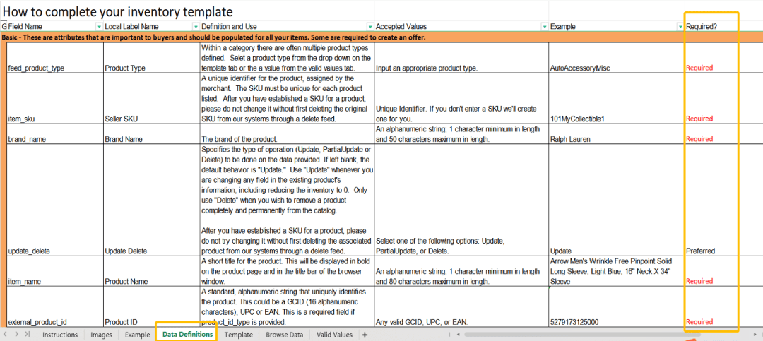 💻下载对应品类产品库存文件模板,在[Data Definitions]表格里标记为Required 属性组全部填写,标记为Preferred和Optional选填项的[基础 Basic], [发现 Discovery], [商品信息完善 Product Enrichment], [尺寸 Dimension] 属性组尽量完善填写