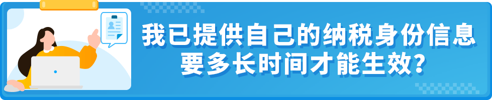 当您更新纳税身份信息后,您的卖家平台“账户信息”页面的“法人实体”部分将显示“已提供,待验证”。如果亚马逊发现您的信息与美国国家税务局记录不符,将会通过电子邮件向您发送操作说明。如果您选择邮寄您的纸质文件而不是同意采取电子签名,亚马逊在收到纸质文件后将需要10~15个工作日进行处理。