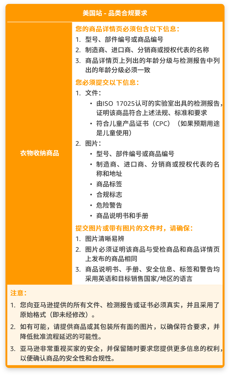 亚马逊要求所有衣物收纳商品均经过检测并符合下列法规、标准和要求: