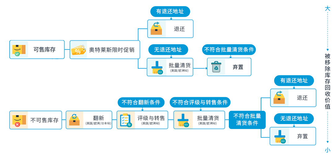 针对不能作为新品销售的积压库存及消费者退货,亚马逊物流批量清货计划帮卖家处理操作/清货商管控/运输/移除事宜,将这些库存销售给与亚马逊有合作的清算商,让卖家在订单创建60天后,回收5-10%的商品价值。