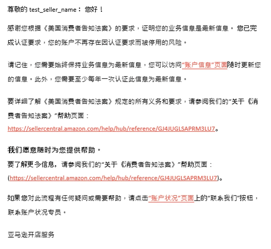 如果您在去年已经完成了《美国消费者法案》所要求信息的提交,那么亚马逊将会在接下来的一段时间内陆续给需要完成此次年度认证的卖家发送通知,请持续关注您的邮件通知,亚马逊会在电子邮件中提供具体的指导和说明(如下图):