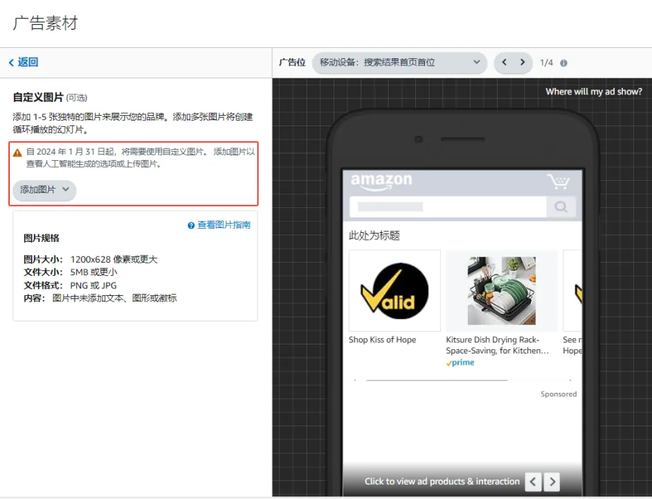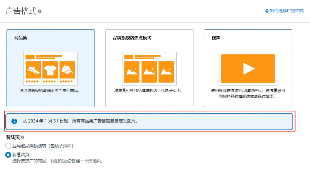 在过往的品牌推广商品集格式的广告投放过程中,亚马逊允许卖家投放仅使用商品图片的广告。从 2024年1月31日起,所有新的和编辑过的品牌推广商品集广告都需要使用自定义图片。2024年5月31日之后,没有使用自定义图片的广告将无法投放,也不会获得展示量。