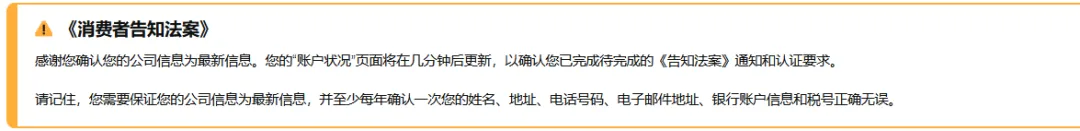 根据《消费者告知法案》,如果您没有在要求时间内完成所需的认证步骤,您的账户可能会被停用。如果您的账户因《消费者告知法案》要求而被停用,请按照亚马逊发送给您的账户停用电子邮件中所述重新激活步骤,或转至卖家平台“账户状况”页面顶部的“重新激活您的账户”,进行后续操作。