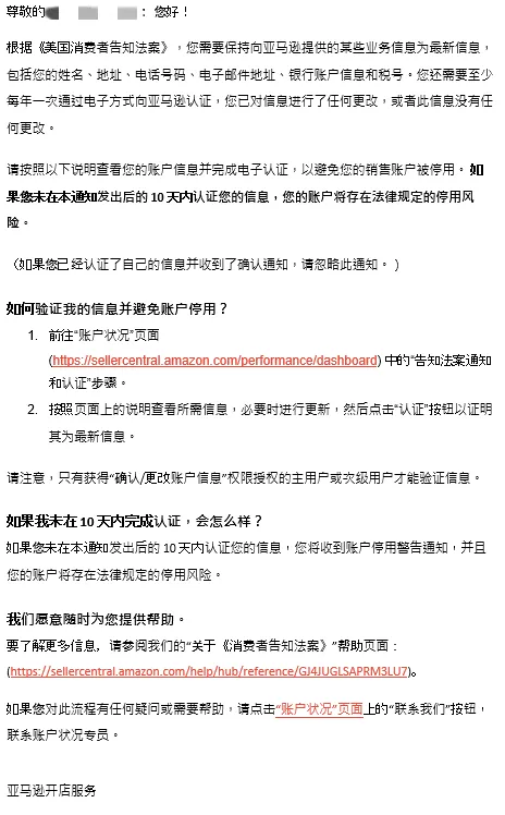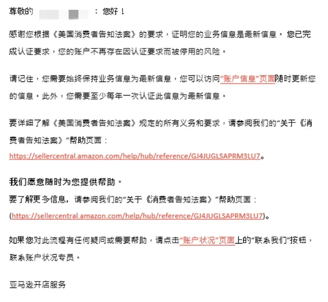 近期,亚马逊在陆续发送标题名为“[请求采取措施] 立即检查您的账户信息,以避免账户将来被停用”的邮件,给到去年6月27日前提交并验证通过了《美国消费者法案》所需五项信息的卖家,来提醒其完成2024年《美国消费者法案》年度认证,邮件内容建议卖家立即采取行动,以避免账户日后被停用的风险。