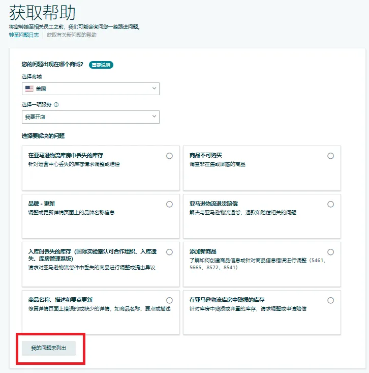 路径:登录亚马逊卖家平台 > 在右上角点击“帮助” > 至页面底部点击“我的问题未列出”。