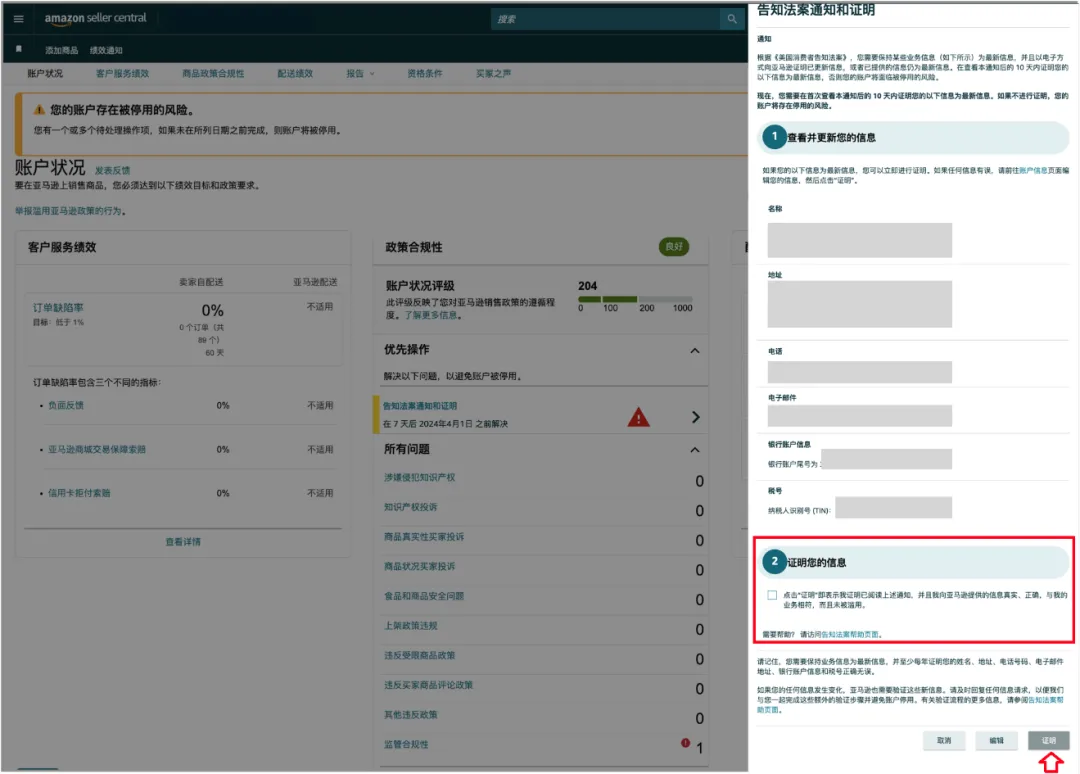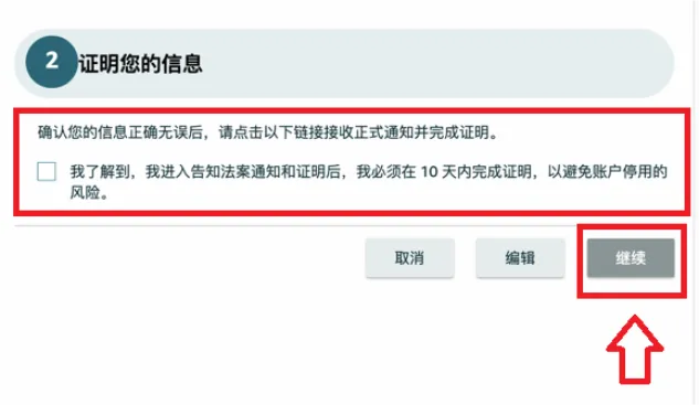 请注意:点击“继续”按钮后,年度认证的流程将会开启,卖家必须在10天之内完成认证以避免对您的账户造成影响。点击“继续”后可再次确认所有信息的准确性,点击“证明”即可完成此次年度认证。