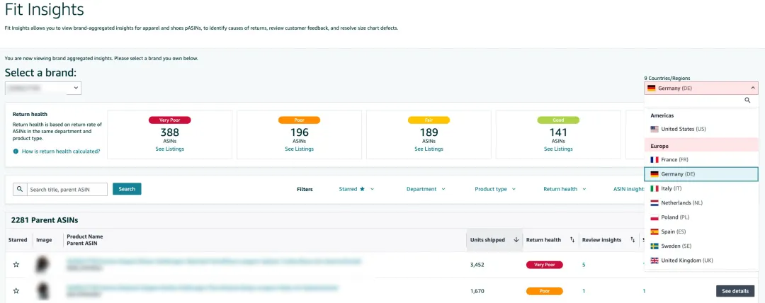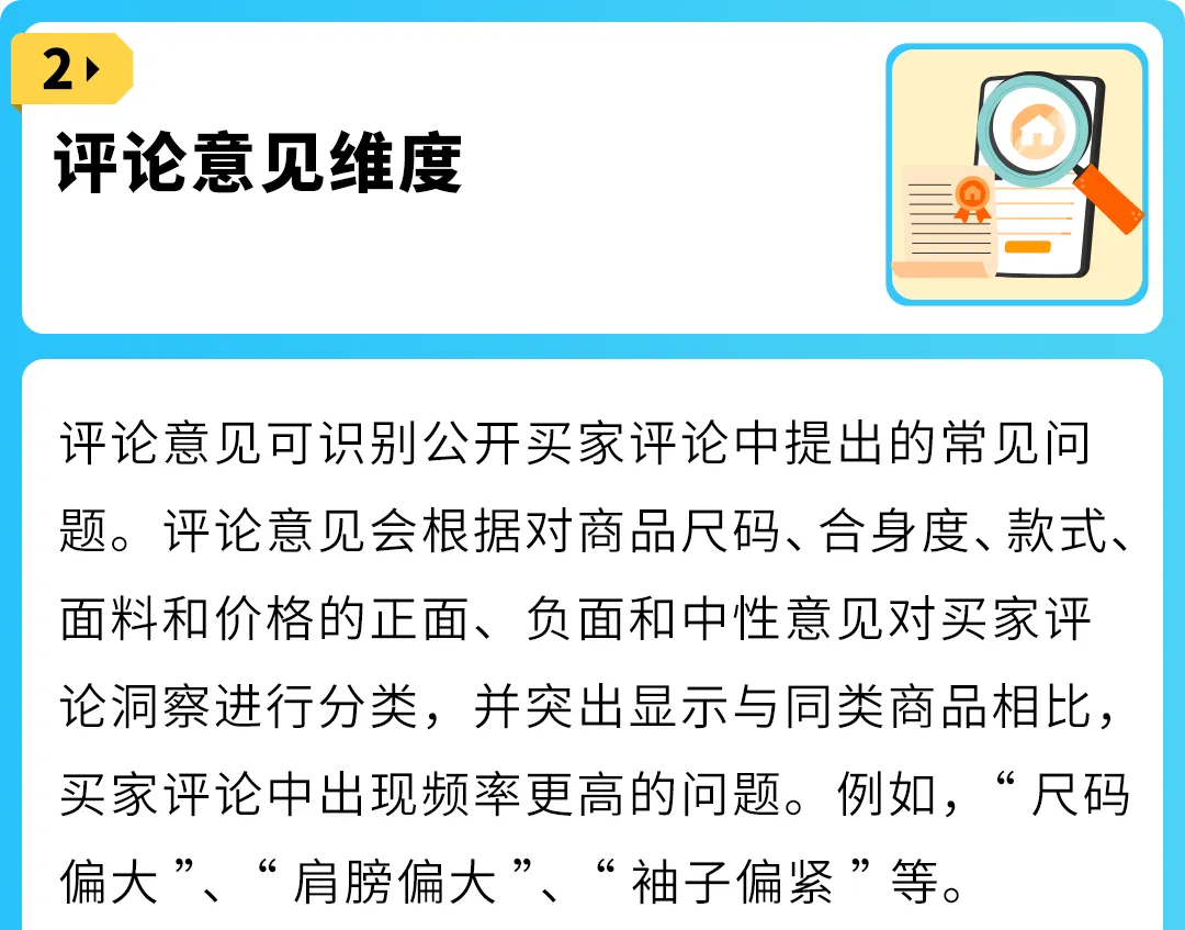 Fit Insights Tool(合身洞察工具)是一款由人工智能驱动的工具,它就像您的智能助手,通过对退货数据、尺码表,还有顾客对尺码、质量和价格的评价的快速抓取及分析,能够帮助卖家从父ASIN层级开始,定位不同尺码的尺寸和合身度问题,精准把握消费者对版型的需求。让消费者放心下单、买得合适,让卖家安心热卖,减少“售后之忧”!