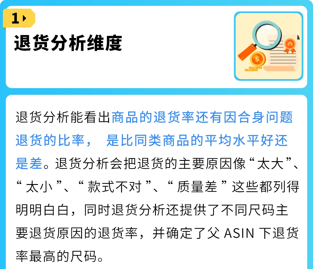 针对“退货率较高、绩效较差”的ASIN,您可以从退货分析、评论意见、尺码表分析三个维度来详细洞察该商品的退货原因。