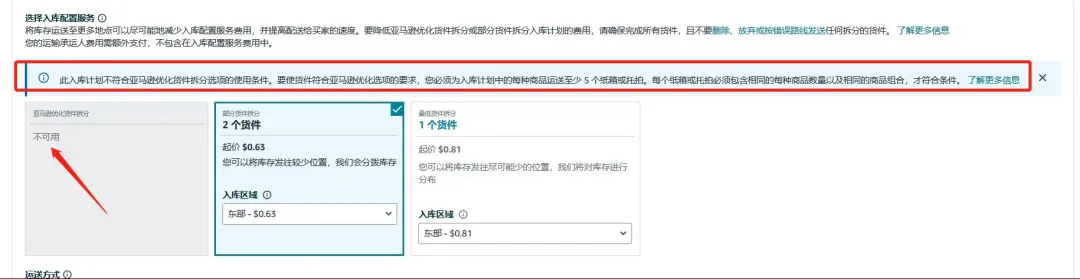 在第二步中,如果您的货件不满足亚马逊优化货件拆分的要求,页面也会给出提示如何调整才能符合要求