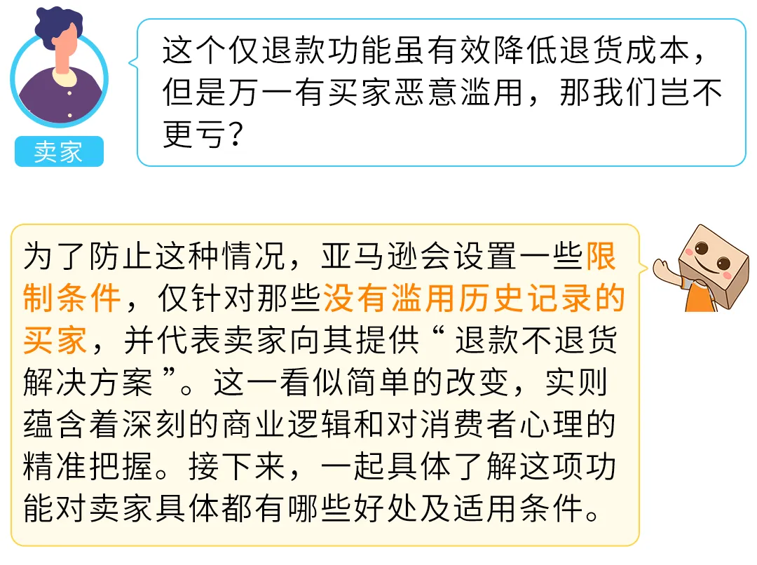 为了提升买家购物体验和优化交易流程,2024年7月30日,亚马逊推出了“亚马逊物流退款不退货解决方案”,也就是“仅退款”功能,为使用FBA的美国卖家提供了一种处理买家退货的新方式。