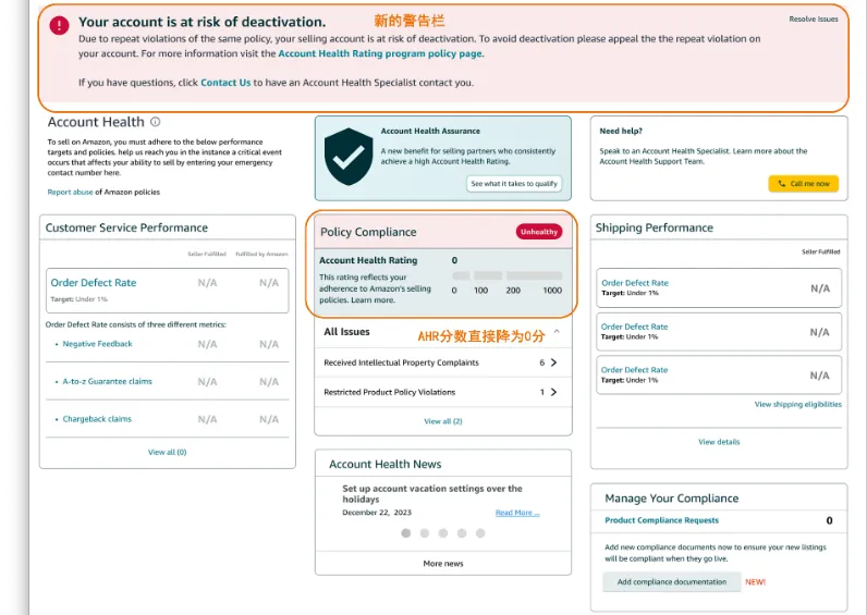 🔶 如果卖家账户出现重复违规的次数达到上限,将会被标记为严重违规,且账户状况评级分数(AHR)将直接降至零分,账户将面临被停用的风险,同时亚马逊将通过邮件通知您。在停用账户之前,您将有3天的宽限期来解决重复违规的警告。您可以按照账户状况页面顶部横幅中的说明进行操作,并通过政策合规控制面板提出申诉。