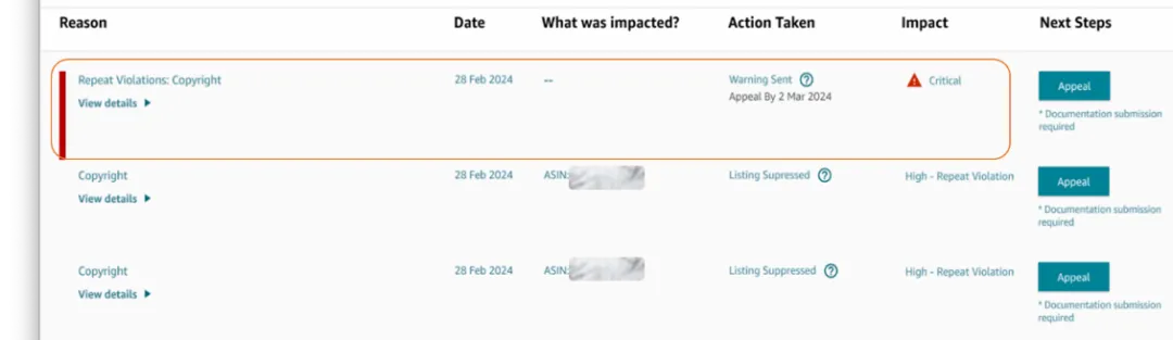 🔸 每次违反同一政策,您的账户状况评级中与该违反政策行为相关的分值都会增加。这意味着,反复违规会导致您的账户状况评级更快地被降级,反复出现严重程度更高的违反政策行为影响更大。为了帮助您识别和跟踪重复违规行为,以更快、更系统地解决问题,重复违规行为会在您的账户状况页面的“影响”栏中被标记。