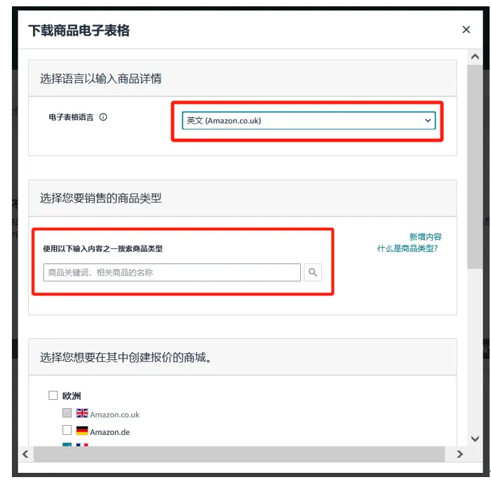 Step4 选择模板语言和您想要标注原产国/原产地信息的商品类型。您可复制以下链接至浏览器,前往亚马逊的卖家平台帮助页面,查看有关商品类型的更多信息👇