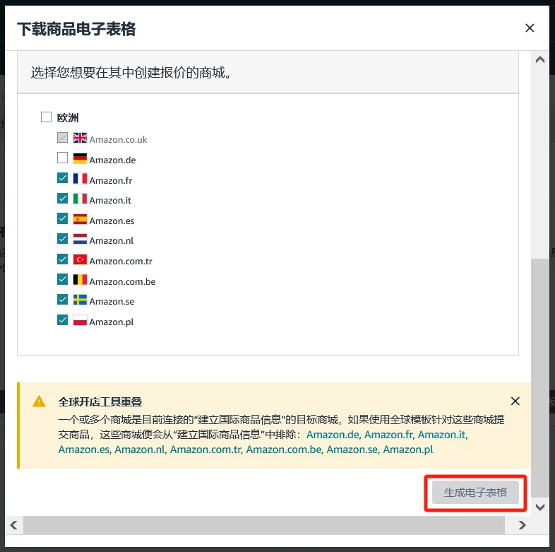 Step5 根据分类节点选择最多20种商品类型,并选择您想要销售商品的市场。然后点击“生成电子表格”。