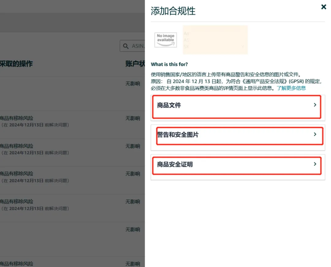 以上三选一即可合规,然而当您的ASIN没有“③商品安全证明”的选项时,意味着您必须为该ASIN上传前面①②两类信息之一。