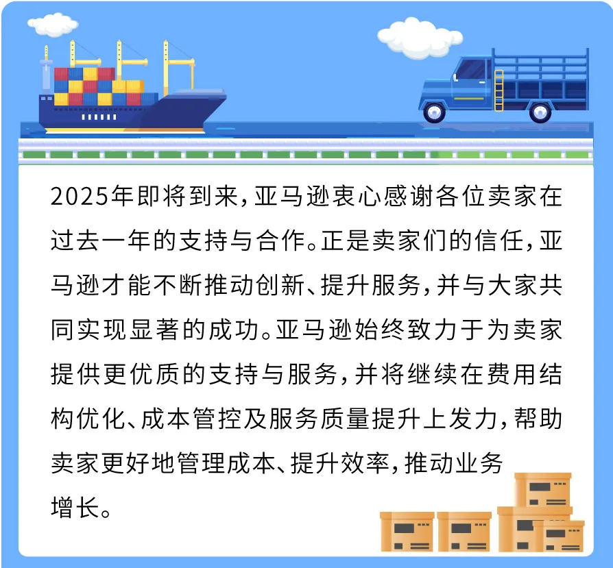 此次费用变更,是亚马逊在服务优化道路上的又一探索。感谢卖家一直以来的信赖与支持,在即将到来的2025年,亚马逊继续与您“并肩作战”,帮您取得更卓越的销售佳绩!