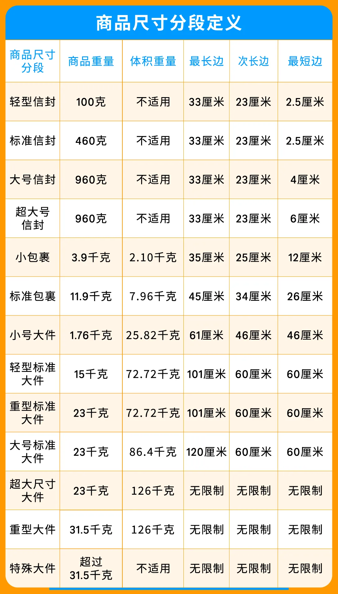 依据尺寸和重量进行了分段,建议卖家可通过优化商品包装尺寸,将商品调整到更小的尺寸段内,从而享受费率降幅。