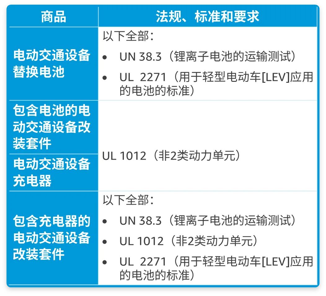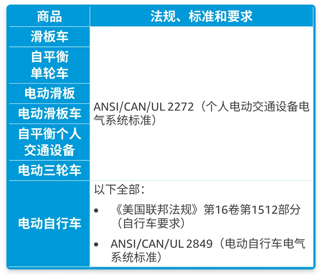 亚马逊要求所有电动交通设备配件均经过检测并符合下列法规、标准和要求: