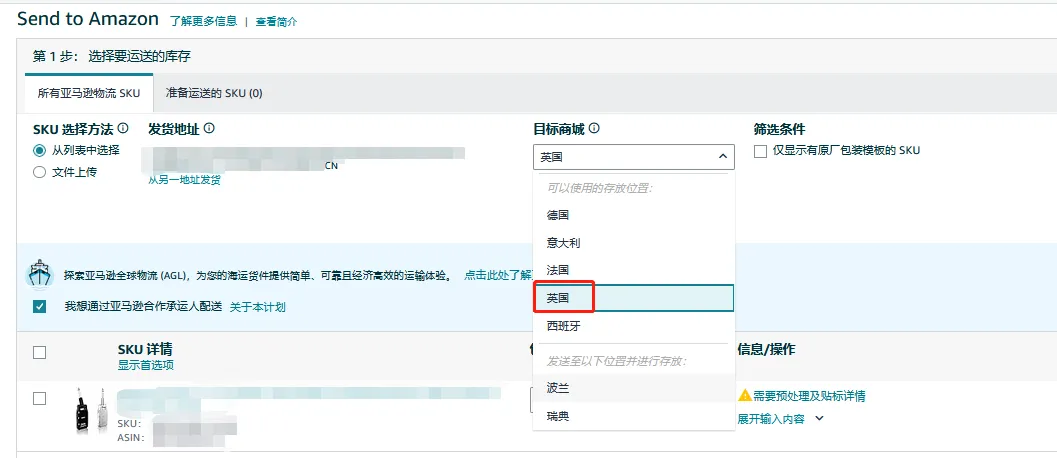 🔘 第三步:选中目标商城为“英国”,并选择和确认真实、有效的“发货地址”。