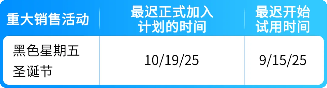 ● 大型销售活动(例如Prime会员日)每年可能会有所不同。在亚马逊宣布这些销售活动时,会同时公布正式加入计划的限制性确切日期,并将添加到下表中。(例:2025年黑色星期五-圣诞节限制期从10月19日开始,最晚试用开始日期为9月15日)。