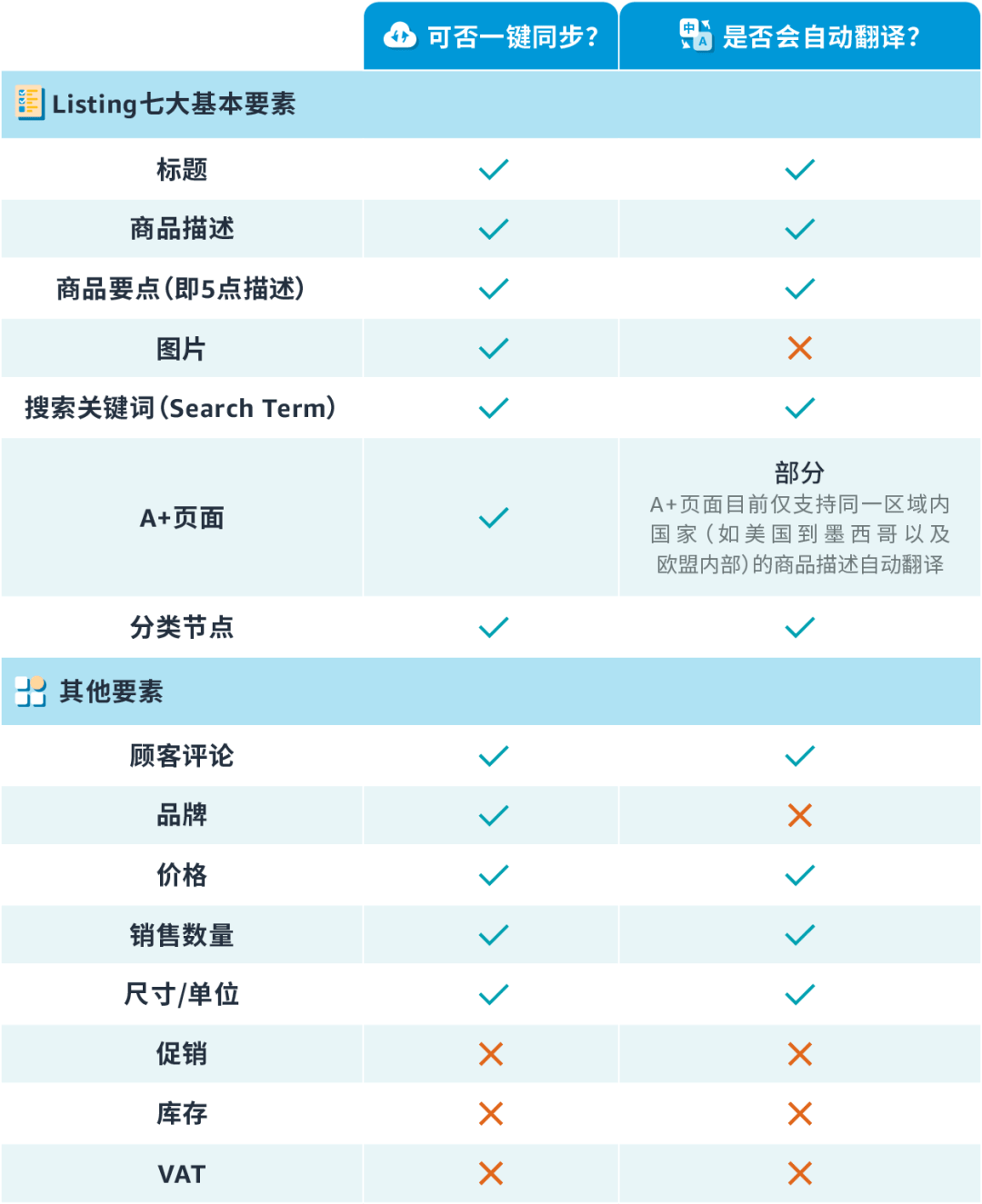 “一键Listing通全球”可以实现哪些内容的同步?又有哪些内容可以自动翻译呢?小编整理了图表让您一图读懂!