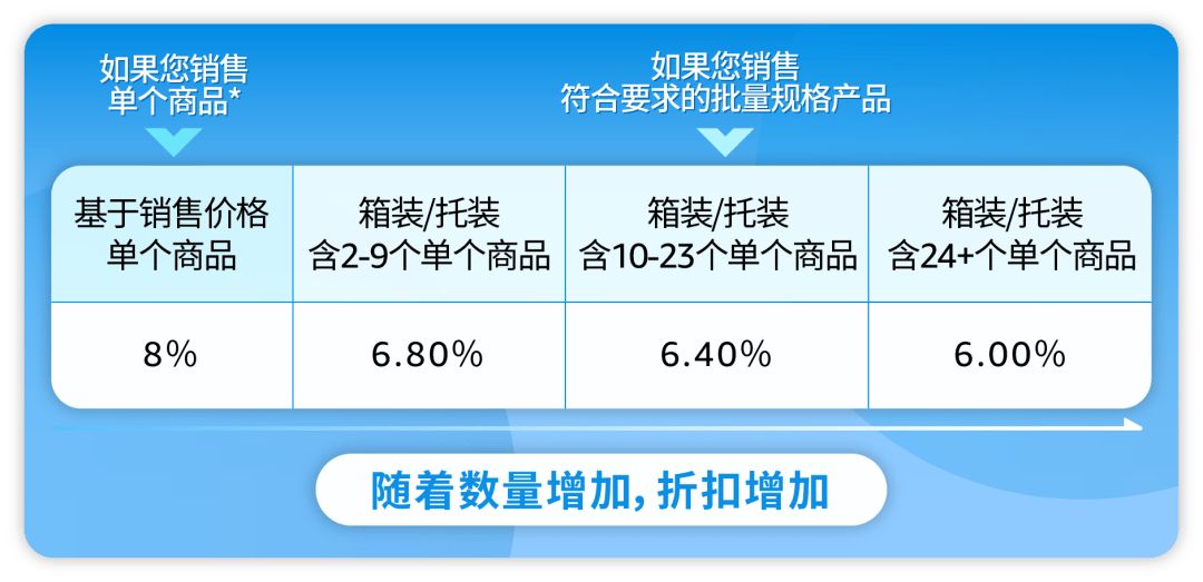 符合批量规格商品(Large Pack ASIN)条件,且在美、日、欧站点售卖的整箱装(Case Pack)和托装(Pallet)商品,可享受15%-25%的销售佣金折扣。
