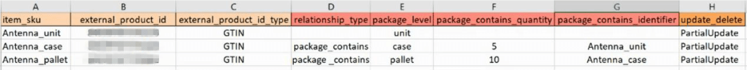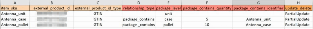 🔹模板中SKU“Antenna_pallet”包含了10个SKU“Antenna_case”,SKU“Antenna_pallet”所在行对应的“package_contains_quantity”和“package_contains_identifier”分别填写“10”和“Antenna_case”;“update_delete”部分选择“PartialUpdate”。