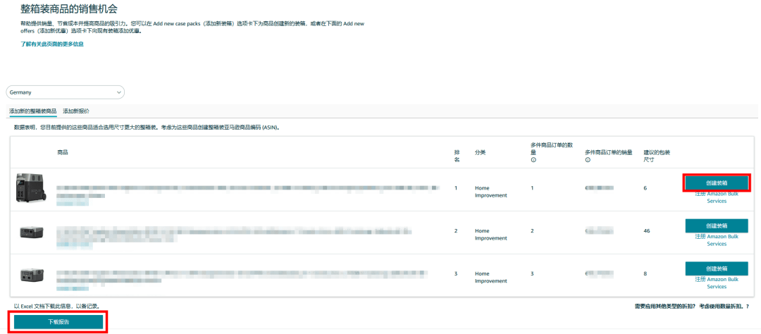 您可以点击“下载报告”按钮,获得更详细的推荐ASIN创建指导;您也可以点击“添加新的大包装商品”按钮,直接添加大包装商品。