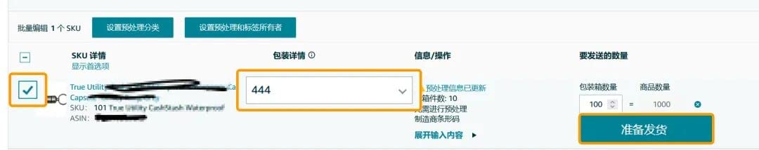 3.2:勾选要出运的SKU,并填写数量,点击“准备发货”按钮。