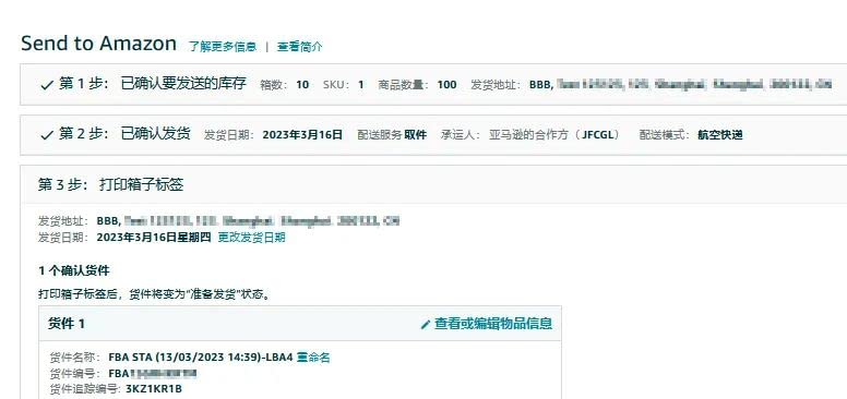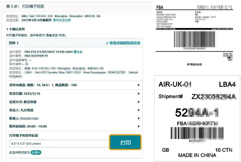 3.7:打印箱子标签,点击打印后,会自动生成FBA标签和运输标签,请和箱号一一对应贴于货件上。