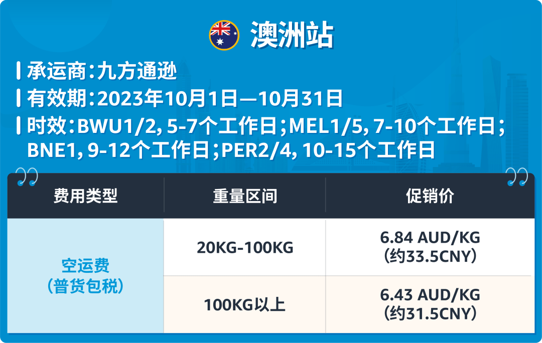 * 带电货需加收带电附加费AUD2.04每公斤。