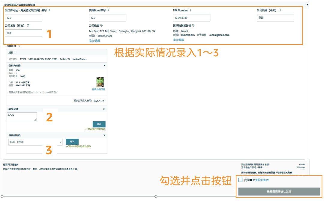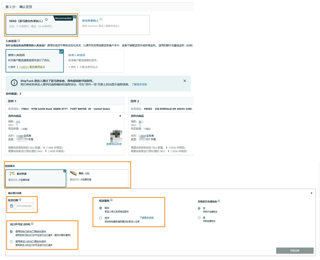 选择配送模式和承运人后,点击“选择并继续”使用服务提供配送方, 若在上一步选择【海运-LCL】服务,将看到以下界面: