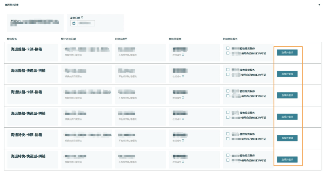 选择合作承运人,并根据需求选择配送模式【航空快递】或【海运-LCL】,选择发货日期,配送服务和出口许可证(出口报关抬头)后,点击“获取运费”。