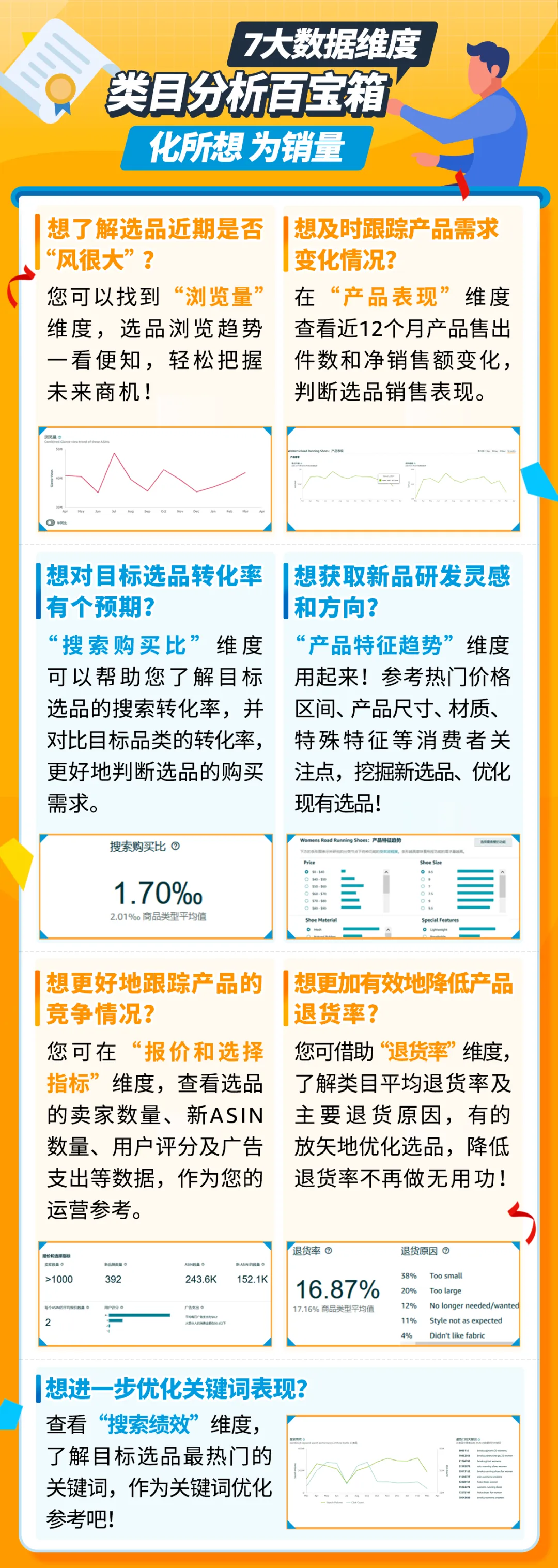 “类目分析”功能来帮您!登录亚马逊卖家平台,进入“选品指南针 > 类目分析”,您可以获取目标类目过去一段时间内的产品需求趋势/浏览量/搜索购买转化比/退货率/退货原因等信息,并通过“产品特征趋势”板块,挖掘或验证买家需求特征,从而完善产品开发方案。