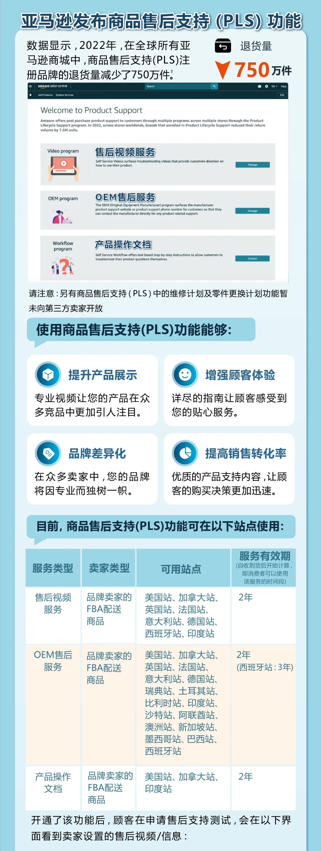 项目虽好,但仍有不少卖家对于该项目知之甚少。目前,商品售后支持(PLS)向卖家开放售后视频服务、OEM售后服务、产品操作文档,3项服务可分开单独申请,在下文中将向卖家一一说明。