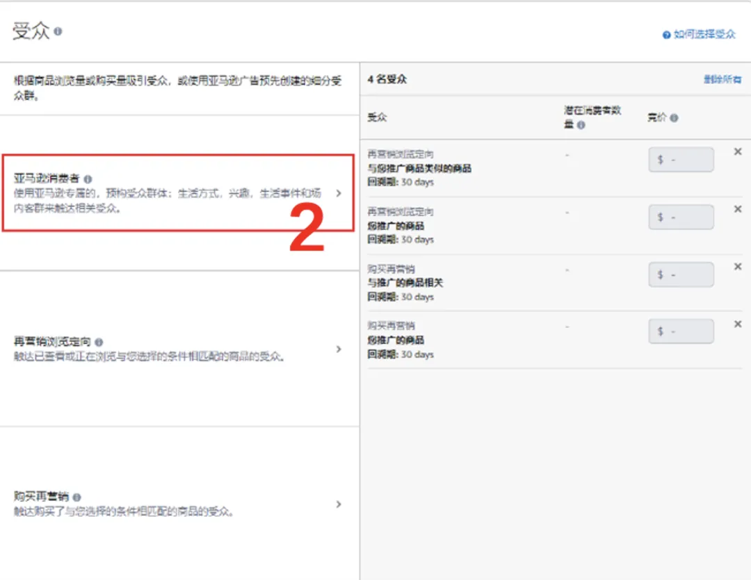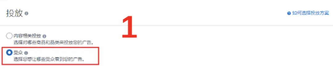 在“投放”部分选择“受众”,然后选择“亚马逊消费者”。如果选择“内容相关投放”,广告将在相关场景中与目标受众互动。