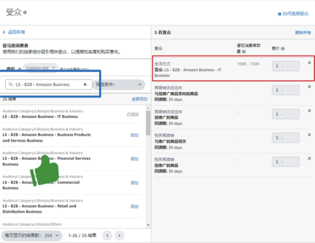 输入“LS - B2B - Amazon Business”,选择并添加目标受众。为每个受众设置竞价。