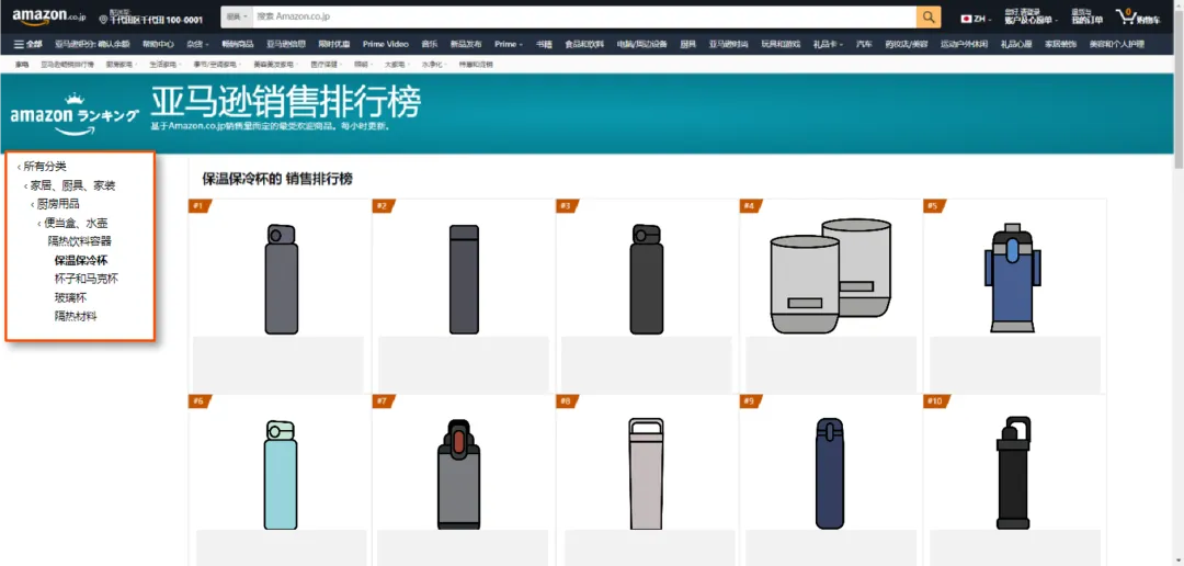 卖家B在保温杯方面的供应链资源较为成熟,猜想日本市场对保温杯需求比较大,因此进入亚马逊日本商城首页点击“畅销商品”,找到保温保冷杯类目(界面如下图)开始验证目标选品是否符合买家需求。