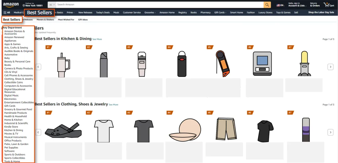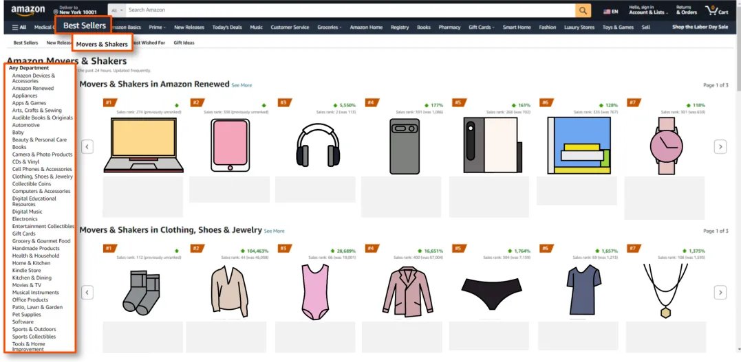 进入不同目的国/地区的亚马逊商城 > 点击黑底白字Best Sellers > 点击五大榜单标签页 > 选择榜单后挑选您感兴趣的类目详细了解。